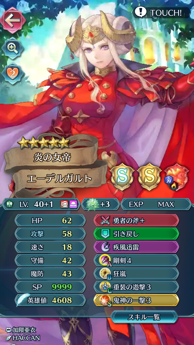 計算ミスで剛剣が発動しなくて敵を殲滅できず敵陣にエーデルガルトが取り残された場面でも生存するなど、事故耐性が高く扱いやすいです。ただし、もし雷の塔がなかったら無理だったなという場面は多いので雷の塔とセットで使うことは必須です。また、疾風迅雷を1試合で2回以上発動する事は全くなかったので、2回目以降が発動しにくい点は飛空城においては短所にはなりませんでした。飛空城以外のコンテンツ(大英雄戦等)で使用した際はそれなりに気になるレベルの短所に感じました。