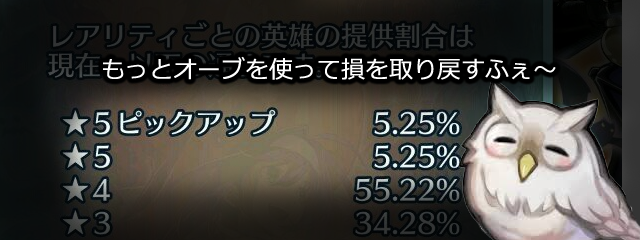 個人的には、確率上昇してしまったそんなに魅力的でないガチャにオーブを回すより、次の新英雄、伝承/神階英雄などの魅力的なガチャに投資する方がよっぽど得だと思っています。確率上昇に関係なく、それ以上オーブを使ってまで引きたいキャラがいるなら引けばいいし、オーブを使ってまで引きたいキャラがいなければ引かなければいいと思います。残りオーブ20、かつ、確率上昇していない状態でも、出る時は出ます。