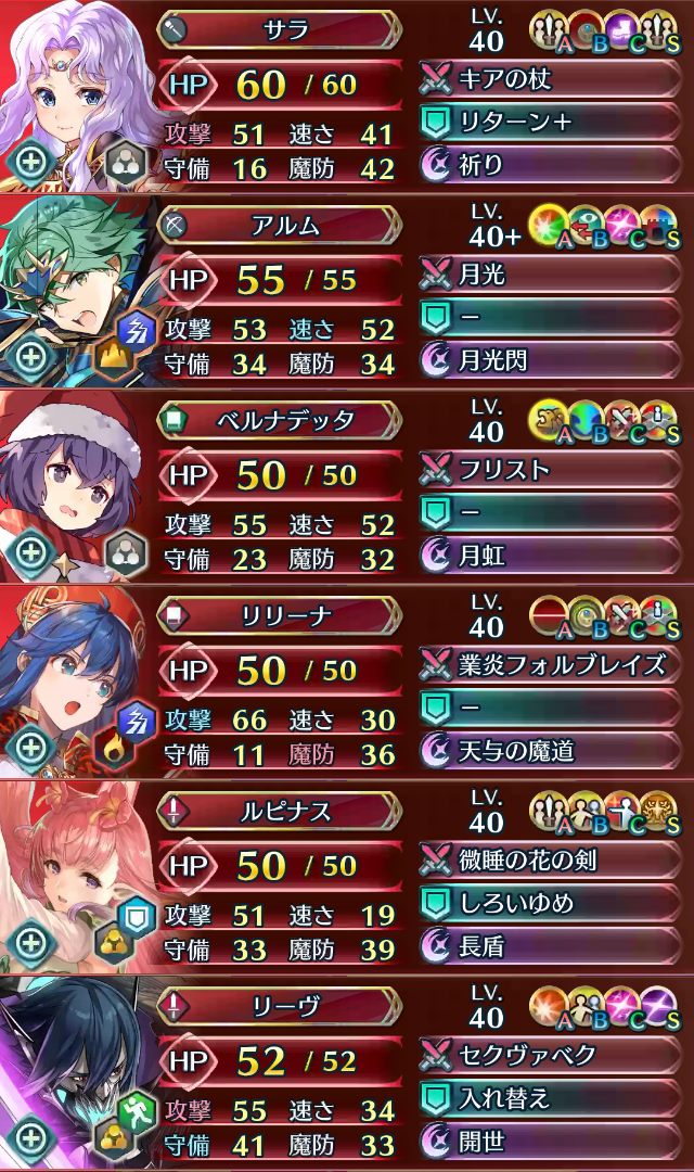 つまり、伝承リリーナを受けられるユニットがいて、かつ、魔防の混乱や魔防の謀策、パニックなどで伝承アルムが弱化されてしまうと、この防衛は機能しなくなり、1ターン目で誰も倒せなくなってしまいます。まぁ説明しないとここまで気づける人は少ないとは思いますが..