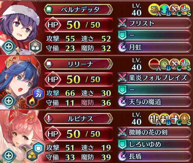 今まで挙げた3つのケースすべてにおいて、ルピナスの再行動後において、伝承アルム、クリスマスベルナデッタの順番で能力値の合計が高くなっていてほしい状況であることが分かります。つまり、ターン開始時は能力値合計の高さはクリスマスベルナデッタ、伝承アルムの順番になっていても問題ないということです。ルピナスが再行動を実行した時の強化によって、これらの順番が逆転するよう能力値を調整すればよいということになります。